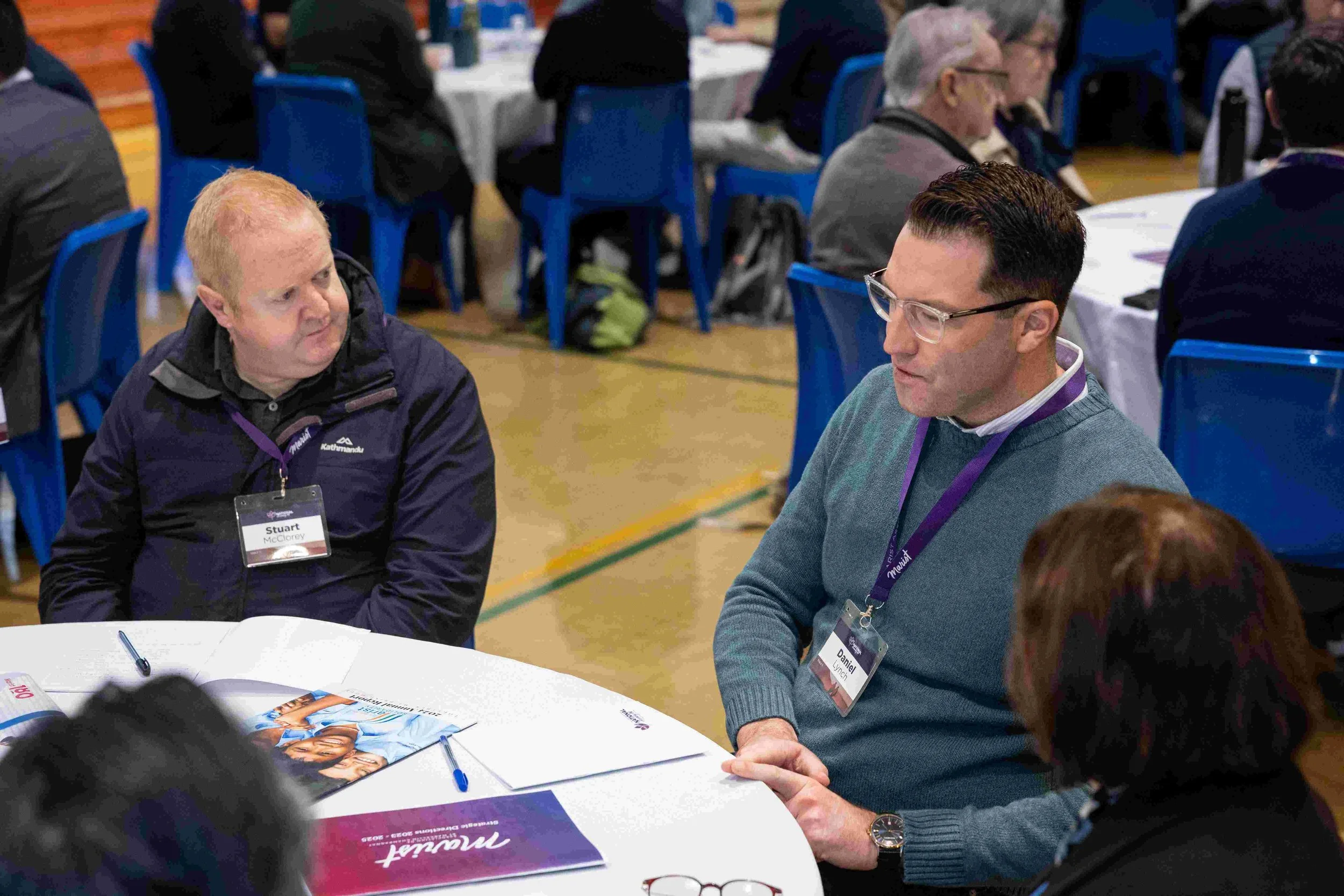Stuart McClorey, left, and Daniel Lynch, right, engaging in one of the Spiritual Conversations sessions at the Assembly.