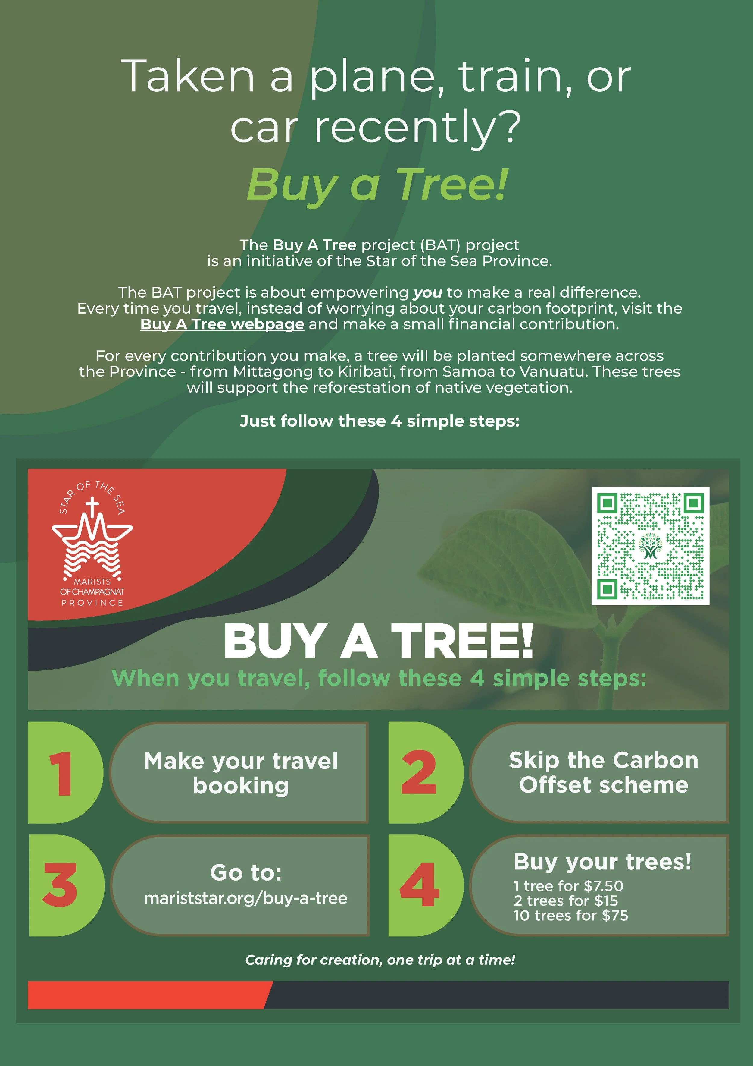 Firstly, if you have travelled over the holidays, or travelling during this term, and would like to contribute to the BAT project, please click on the link on the flyer below, or scan the QR Code to literally ‘buy a tree’!