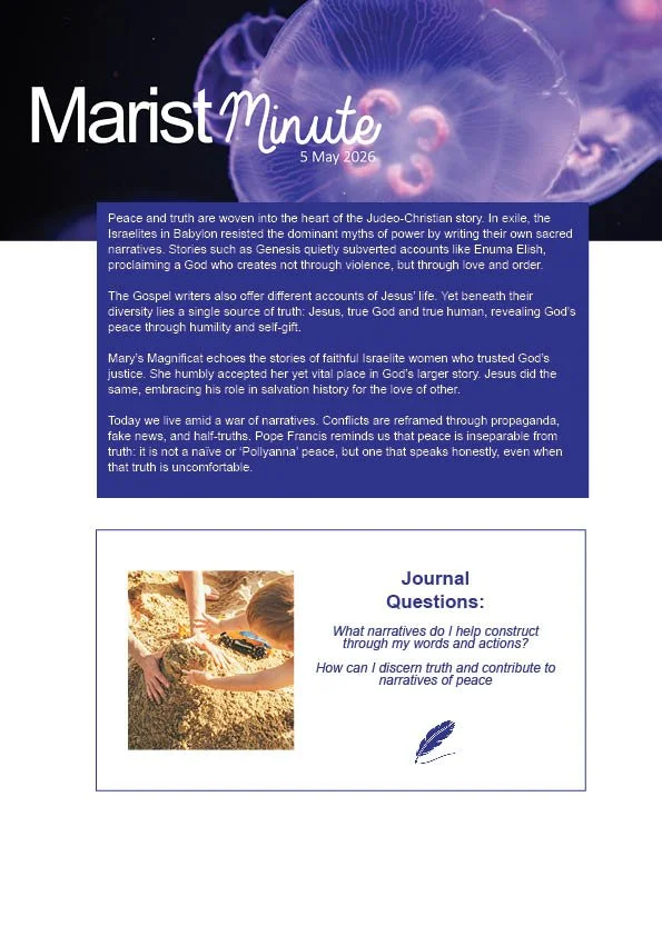 The Marist Minute, a monthly publication, offers a short reflection on life, faith and being Marist. These reflections invite the Spirit into our lives as we praise and listen to God in the minutes of our Marist journey, recognising and inviting God into our everyday moments.